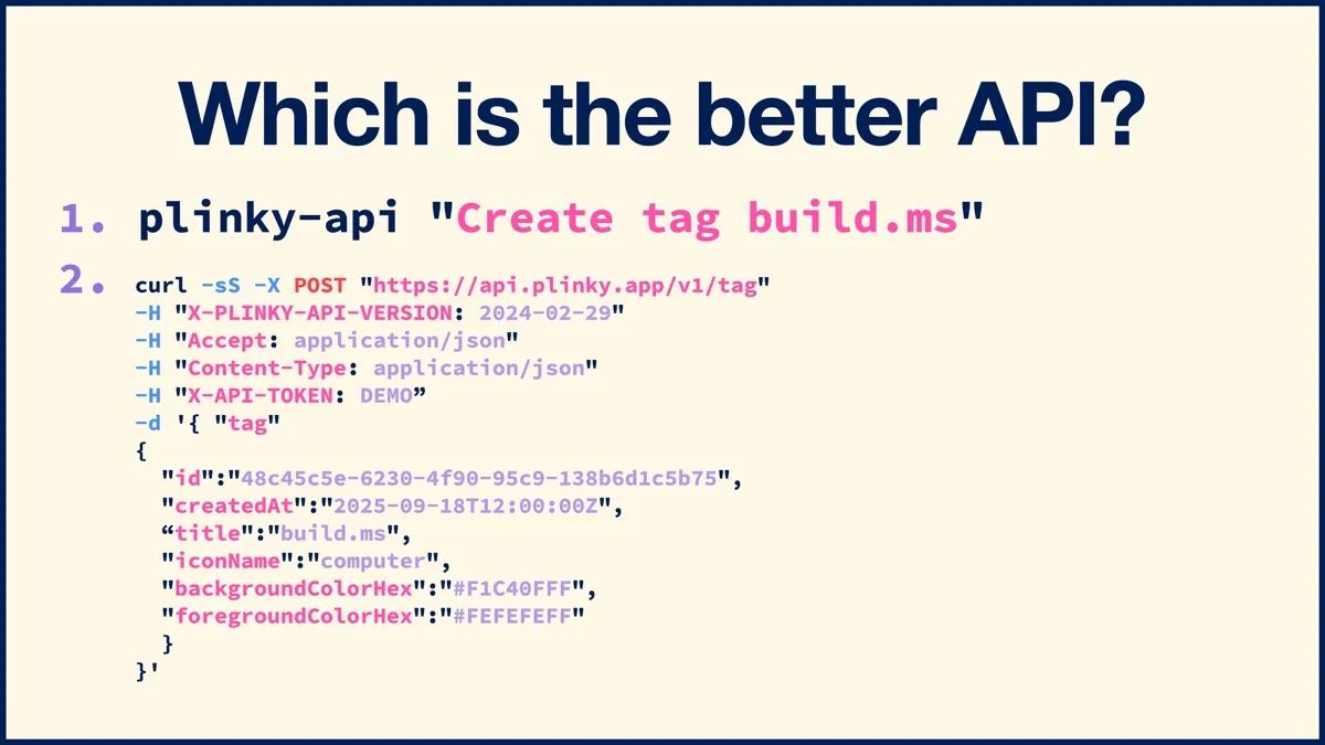 But what if I had a personalized tool made just for Plinky? What if I could simply type Create tag build.ms and have AI create and execute the correct curl request for me? This is Scribblenauts for Software thinking.