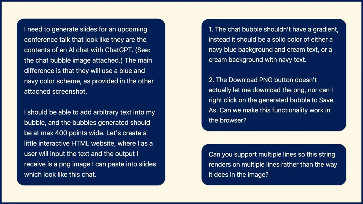 Is this chat bubble generator my life’s work? Of course not. It’s just a simple tool — but humans are tool builders. For a motivated developer, building the tools you need on-demand with the help of AI is empowering. Rather than sitting in Keynote all day manipulating shapes until they look just right, I automated the process by creating a piece of software.